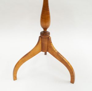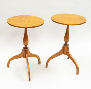 Harvard Shaker Tripod Tables in Tiger Maple. 25 1/2″ tall with a 16″ diameter top.
